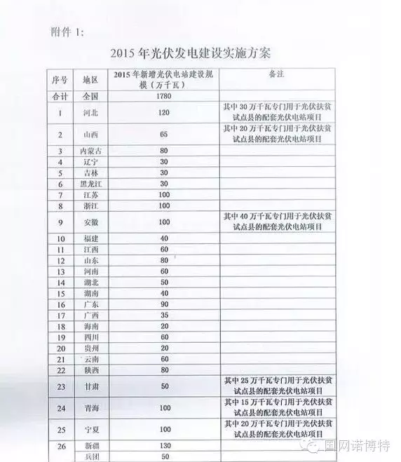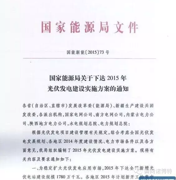 國家能源局關于下達2015年光伏發(fā)電建設實施方案的通知